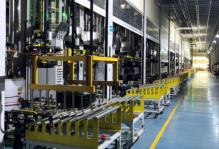 在這個(gè)“黑燈車間”——通用股份乘用胎工廠硫化車間生產(chǎn)線上,生產(chǎn)主力不再是工人,取而代之的是機(jī)械手臂、EMS小車、堆垛機(jī)、全自動(dòng)硫化機(jī)等等,它們?cè)跓o照明的條件下,為200多個(gè)規(guī)格型號(hào)的6000多條胎胚同時(shí)進(jìn)行自動(dòng)硫化作業(yè),實(shí)現(xiàn)24小時(shí)不間斷生產(chǎn)。2019年,該車間還被評(píng)為無錫市智能車間。