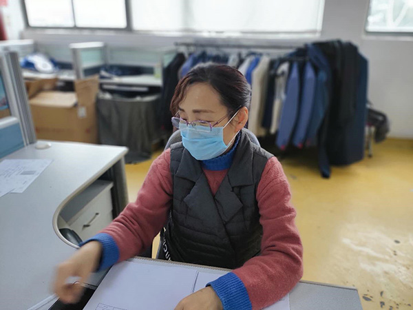 生產(chǎn)任務(wù)更艱巨,面料顏色要求比較特殊,而目前防護(hù)材料又是全球緊缺物資,因此,解決3月1日上午出運(yùn)的3.8萬件面料問題,最為關(guān)鍵。老黨員顧彩紅再次自動(dòng)請(qǐng)纓,挑下采購面料的重?fù)?dān)。