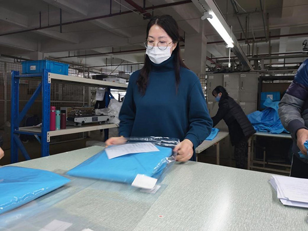 當(dāng)天晚上,紅豆國際黨委書記戴敏君立即號(hào)召黨員干部赴生產(chǎn)“前線”支援,于是3月1日早上7點(diǎn),在一線生產(chǎn)車間,出現(xiàn)了紅豆500多名黨員干部包裝“戰(zhàn)衣”,帶領(lǐng)始終在一線堅(jiān)守的廣大員工一起加油干的火熱場面。
