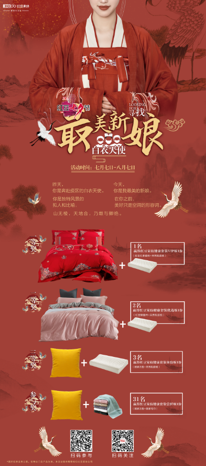 不知不覺(jué),2020年已經(jīng)過(guò)半,7月正值第20屆“紅豆七夕節(jié)”啟動(dòng)之際,紅豆家紡“尋找最美新娘”的活動(dòng)也緩緩拉開(kāi)序幕。無(wú)論開(kāi)年經(jīng)歷了多少磨難、多少坎坷,在2020年這樣注定不平凡的一年里,你應(yīng)該有很多動(dòng)人的故事要和我們分享吧,是抗疫前線不眠不休的白衣天使,還是因?yàn)橐咔楸黄确指?、推遲婚期的最美新娘?