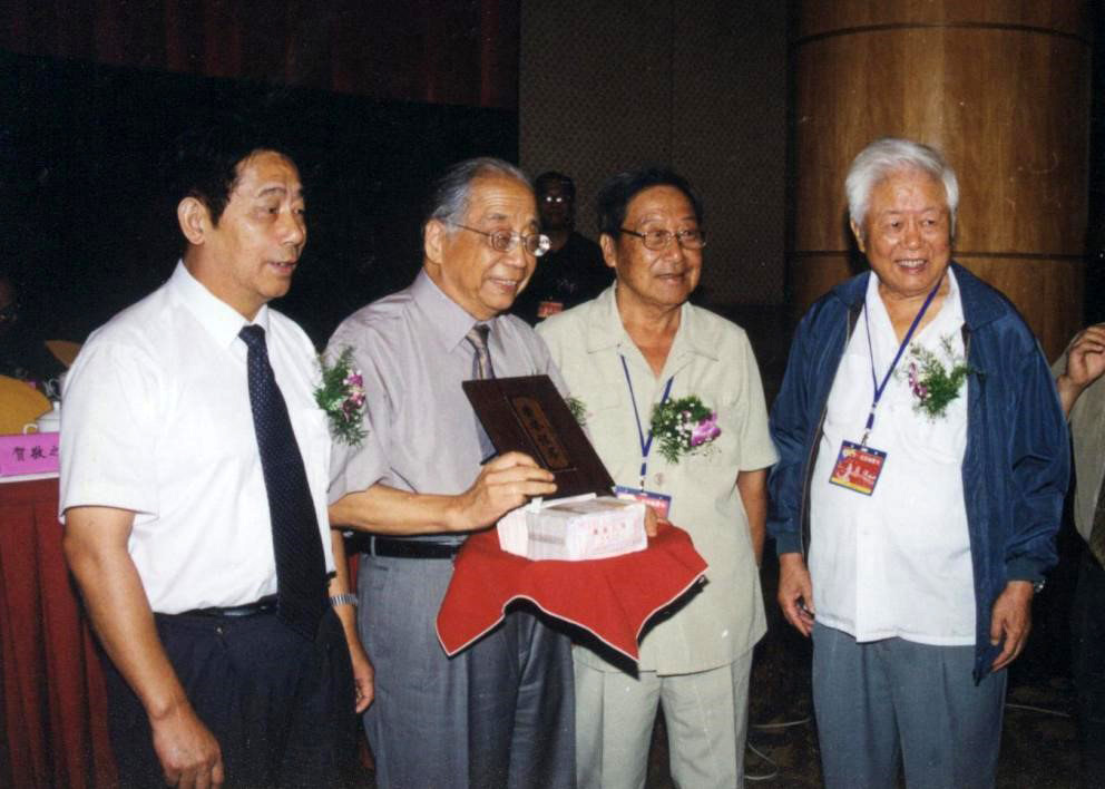文化部原代部長、著名詩人賀敬之(右二),原中華詩詞學會會長孫鐵青(右一),紅豆集團創(chuàng)始人周耀庭(左一)為劉征(左二)頒獎