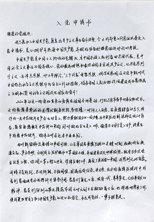 紅豆集團國際公司的員工梁艷的再次向黨組織遞交入黨申請書的原因很簡單,“為了支持一線疫情防控,集團緊急組建黨員突擊隊支援防護服、口罩生產線,負責最緊急、最艱苦的工作。我也報名了,因我還不是黨員,所以沒有把最重的任務安排給我?!笔艿缴磉咟h員的激勵,讓梁艷鼓起勇氣,擬出了這份“疫情火線入黨申請書”。